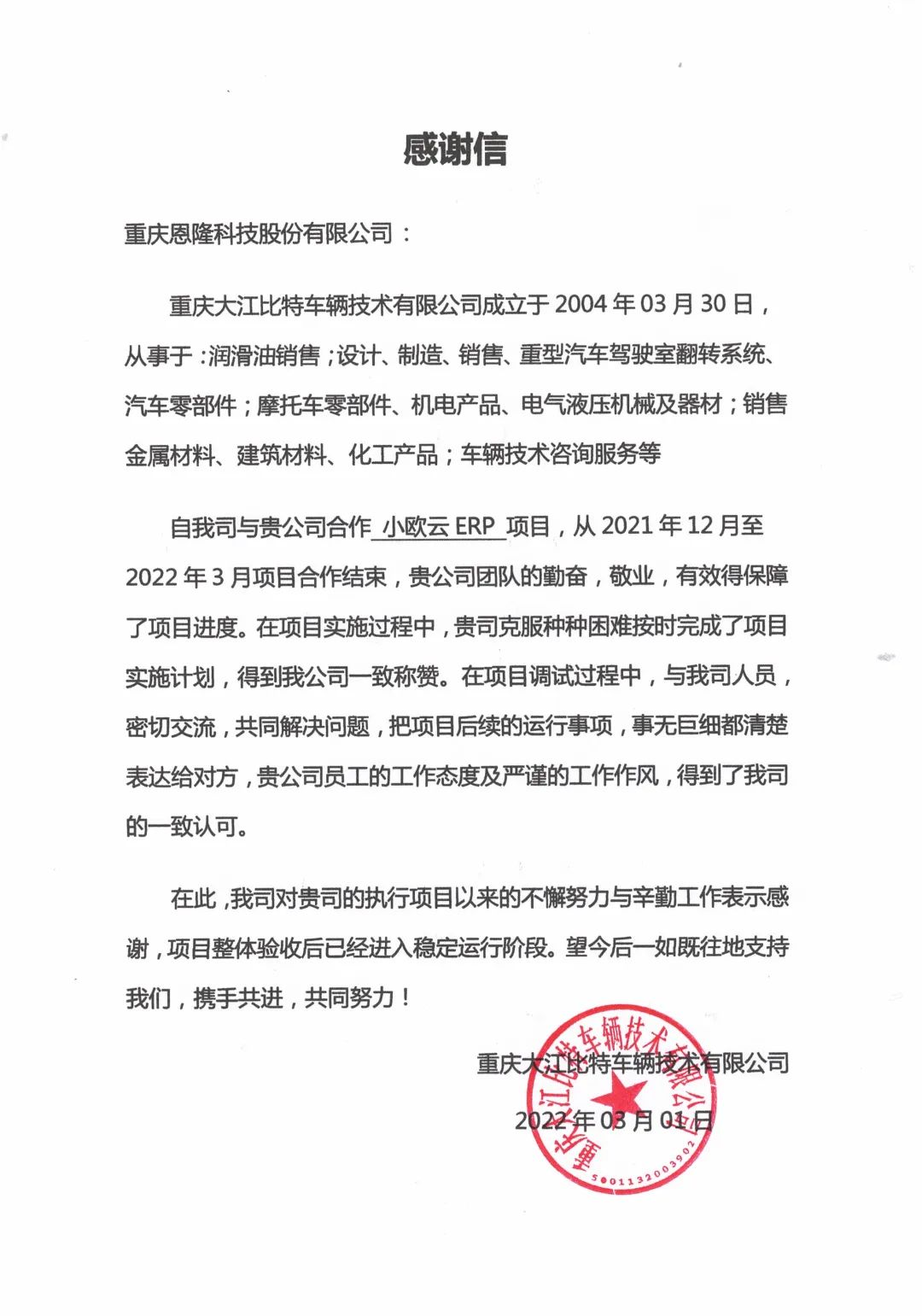 近日,我司收到一封来自大江比特有限公司的感谢信。信中对与我司团队的勤奋、敬业服务表示肯定,感谢恩隆科技对大江比特执行项目以来的不懈努力和辛勤工作表示感谢。
